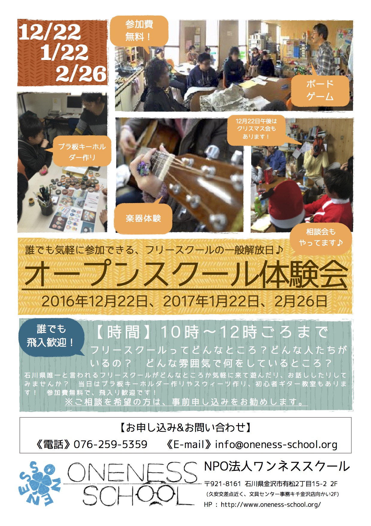 ワンネススクールではどなたでも気軽に様子を見に来れる、オープンスクール体験会を企画しております! 気になっている方がいらっしゃればお気軽にご参加ください! 12月22日の午後からはクリスマス会をやんわりとやります。気が向けば午後もご参加下さい(クリスマス会は食費実費1人300円頂きます) 記事のシェア大歓迎です♪(^ ^)/ —————————————————————————————- 誰でも気軽に参加できる、フリースクールの一般解放日♪ 「オープンスクール体験会!」 フリースクールってどんなところ? どんな人たちがいるの? どんな雰囲気で何をしているところ? 石川県唯一と言われるフリースクールがどんなところか気軽に来て遊んだり、お話ししたりしてみませんか? 当日は今ワンネススクールに通っている13歳〜18歳までのワンネス生がお手伝いしてくれます。 参加費無料で、飛入り歓迎です! 気になる方はお気軽にお問い合わせください。 当日は・・・ ・プラ板でキーホルダー作り(予定) ・スウィーツ作り(12月22日はクリスマスケーキデコレーション) ・カードゲーム、ボードゲーム遊び ・楽器体験 ・保護者の方は別室にて相談会も行っています。(※ご相談を希望の方は、事前申し込みをお勧めします。) など行っております!   —————————————————————————————- 日時:2016年12月22日(木)、2017年1月22日(日)、2月26日(日)10時~13時ごろまで 場所:ワンネススクール金沢校舎(金沢市有松2丁目15-2 2F) 費用:無料(12月22日午後のクリスマス会は食費実費1人300円頂きます) ※相談希望の方は事前申し込みをお勧めします。 【お申し込み&お問い合わせ】 電話:076-259-5359 E-mail:info@oneness-school.org NPO法人ワンネススクール 〒921-8161 石川県金沢市有松2丁目15-2 2F (久安交差点近く、文具センター事務キチ金沢店向かい2F) HP : https://www.oneness-school.org/   ]]>
